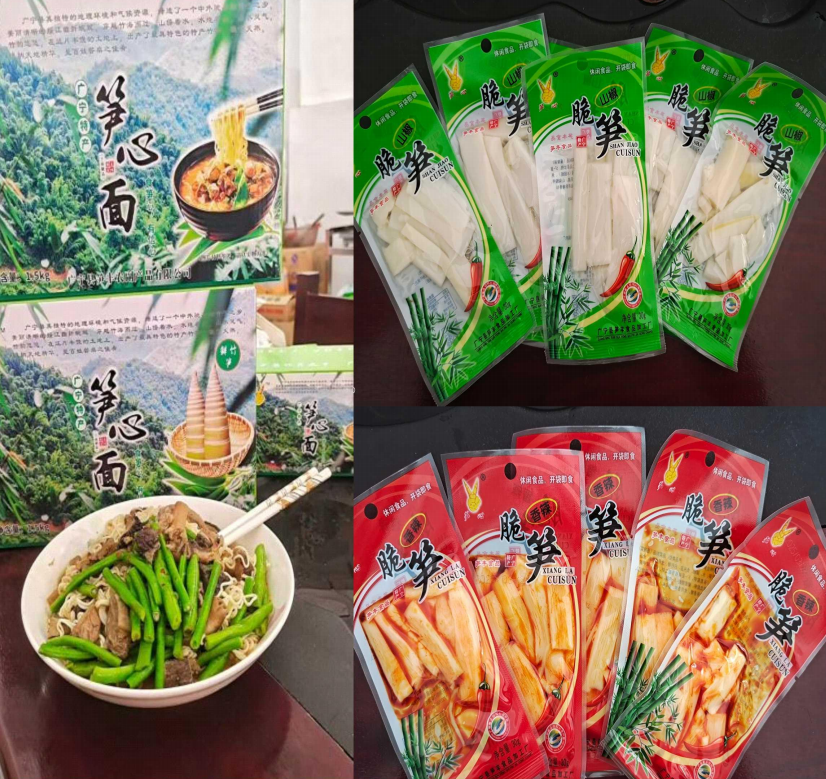 广宁县笋丰农副产品有限公司是一家专业做麻竹笋农副产品的公司。其生产的笋丰脆笋和笋心面均采用洲仔种植的麻竹笋为原料。笋丰脆笋口感极为脆嫩,分别有原味清水笋、泡椒笋、红油香辣笋、酸笋等口味。笋心面采用高筋小麦粉加入麻竹笋原浆,零添加香精色素,保留了竹笋的原始风味和营养,是绿色健康的食品。